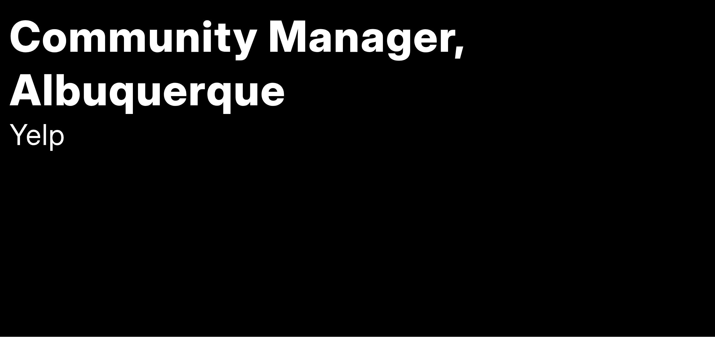 As the Albuquerque, New Mexico Community Manager, you will be a full-time Yelp employee (working out of your home or anywhere in your metro with WiFi) at the helm of a vibrant, buzzing community of locals who drink, shop, and play their way through the city via peer recommendations on Yelp.