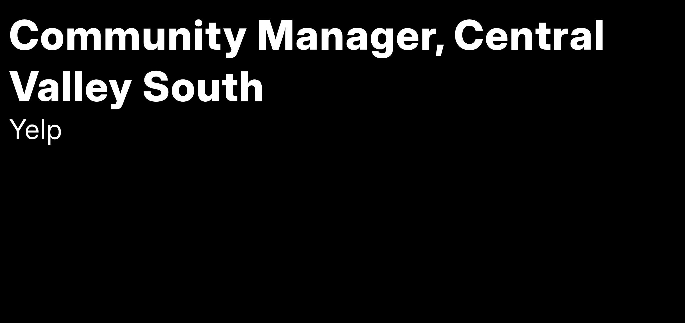 As the Central Valley South Community Manager, you will be a full-time Yelp employee (working out of your home or anywhere in your metro with WiFi) at the helm of a vibrant, buzzing community of locals who drink, shop, and play their way through the city via peer recommendations on Yelp.