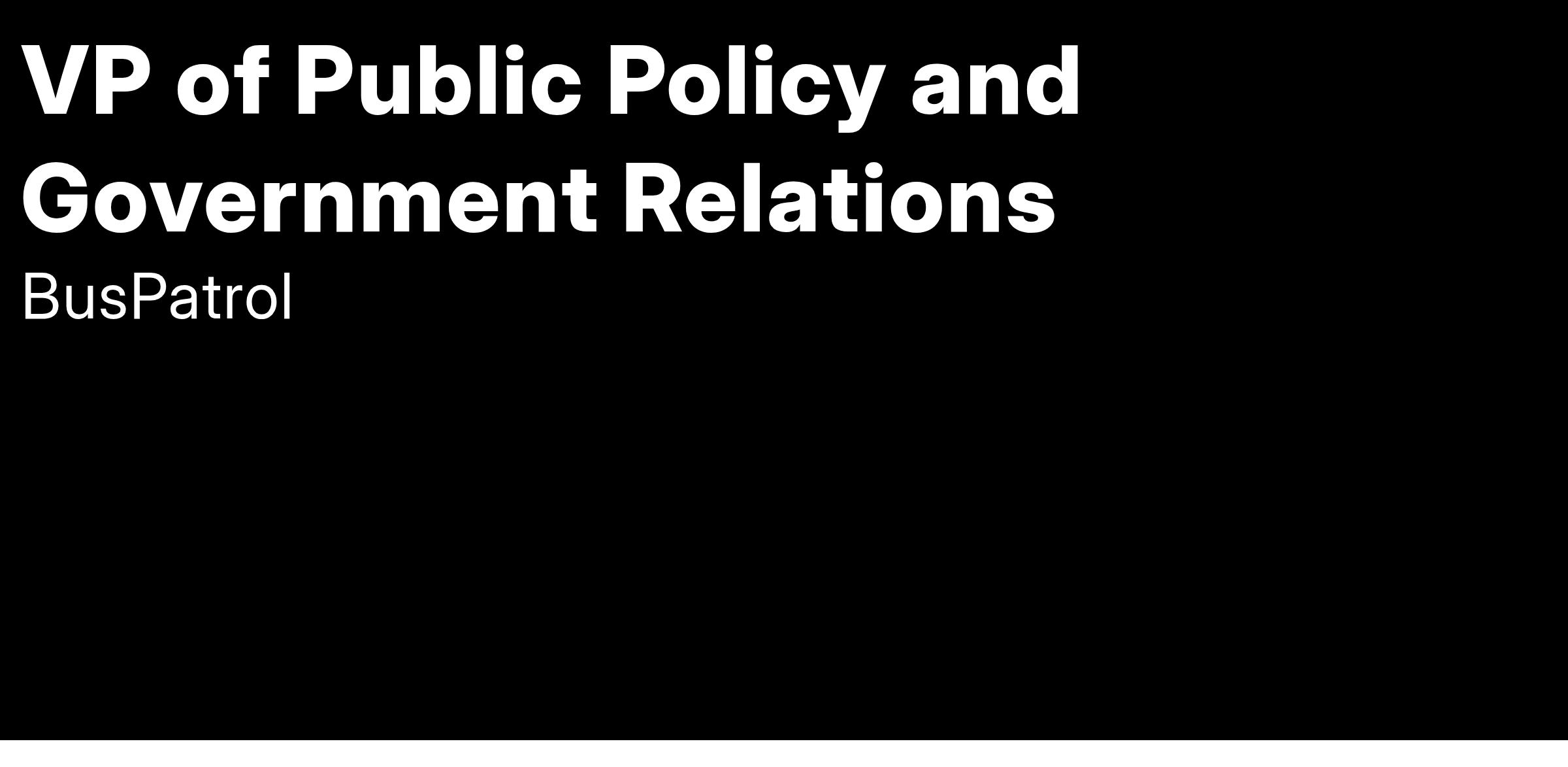 BusPatrol is seeking a sharp and savvy leader to join our team as Vice President of Public Policy and Government Relations. This role is ideal for someone who is a political strategy thought leader with superb writing and oral communication skills, impeccable research abilities, and a keen eye for detail concerning state and local laws. We are seeking a strong team leader who thrives in the dynamic world of public policy, coalition building, and communications strategy around leveraging technology to advance traffic safety causes. The VP will play a critical role in shaping legislation and advancing company business development to expand growth opportunities and safety impact. The VP will also serve a key conduit to our operations, technology/product, legal, implementation and account management teams around policy requirements and compliance. Lastly, the VP will serve at times as a public-facing evangelist for the company at conferences, on panels, and interviews with media concerning traffic safety and technology, and support white paper development to position and promote the quantitative safety impact of our programs.